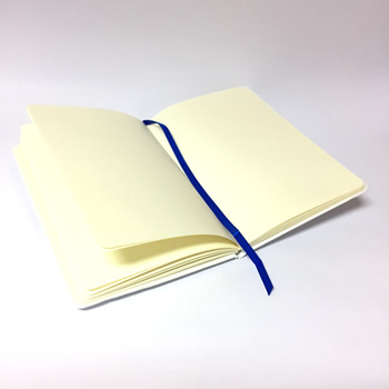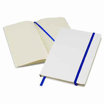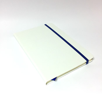 Libreta tipo "Whiteskine" tamaño A4, con cubierta de cartón piedra forrada en PU (cuero sintético) blanco de 1.5mm de espesor. Interior 80 hojas limpias amarillas de 80gsm. Incluye banda elástica y huincha separador de hojas de color. Presentación individual en bolsa de polipropileno.